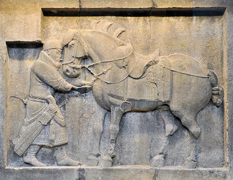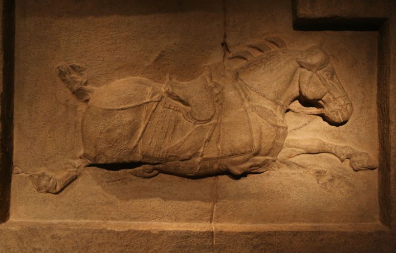 唐昭陵六骏石刻是为纪念六匹随唐太宗征战疆场的战马而刻制的。昭陵六骏石刻原本在陵园最北端的玄武门东、西庑廊对称排列,总体呈阶梯状,由北向南渐次升高,马头都是朝向南方的祭坛。“昭陵六骏”选用精细石材,六块石材外尺寸大小基本一致,每块石刻宽约2米,高约1.7米,厚约0.4米。每块石的四周均先预留凸起状的石边框,姿态神情各异的六匹骏马均取侧面像,采用雕凿石表达15厘米之深的高浮雕形式,其中三匹做直立状,三匹为奔驰状。