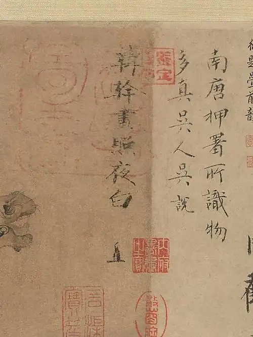《照夜白图》描绘了一匹骏马“照夜白”的形象。 为了在白绢上表现这匹白色的宝马,作者在描绘马时,通过工笔重彩手法,经过巧妙构思、对比手法,选取马鼻被拴的情形,不仅可以表现出“照夜白”的桀骜不驯,在色彩处理上还可以利用马桩的深色调衬托出马的矫健造型,在手法上做减法,达到美妙的画面平衡。 ”照夜白“是唐玄宗李隆基的坐骑,图中“照夜白”系一木桩上,昂首嘶鸣,四蹄腾骧,似欲挣脱缰索。全画只在画面略微偏右的位置描绘了一匹骏马的形象。这匹骏马被拴于一根马桩之上,明显可以从画中感受到它不甘于束缚、怒目圆睁、昂首嘶鸣,飘逸的鬃毛、耸起的耳朵和抬起的前蹄,加强了画面所要透露的紧张感。 据考证,马的头、颈、前身为真迹,而后半身为后人补笔,马尾巴已不存。 不同于鬃毛的飘逸,画中的骏马并没有尾巴。有专家认为,《照夜白图》已并非全是韩干的亲笔了。画面从脖颈往左的躯干部分已经残破,现存的只是后人的补笔。《照夜白图》左上题“韩干画照夜白”六字,系南唐后主李煜题字。左边上方有“彦远”二字,似为唐代著名美术史家张彦远的题名;左下有宋米芾题名,并盖有“平生真赏”朱文印。 南宋贾似道的“秋壑珍玩”、“似道”等印及明项子京等收藏印;卷前有向子湮、吴说题首;卷后有元危素及清沈德潜等11人题跋和乾隆弘历诗跋。