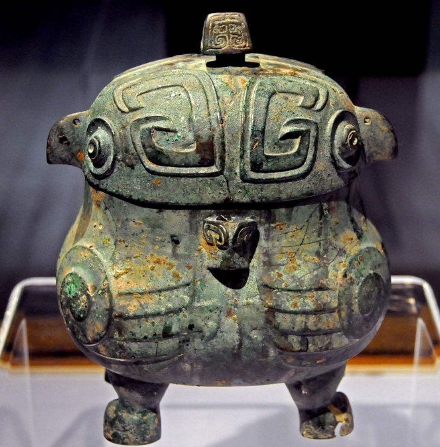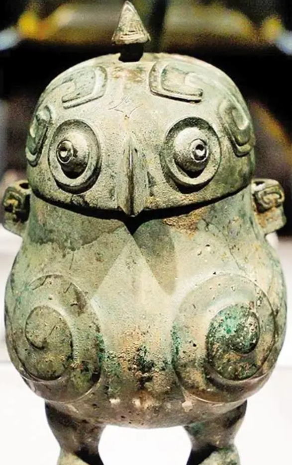 商代晚期青铜器精品。盛酒器。形如两鸮相背而立。盖为双鸮首,环目,尖喙,弯眉,盖中央置四阿顶方柱钮,饰雷纹。腹作双鸮身,子口微敛,垂鼓腹饰卷曲羽翼纹。身下为四爪,两两相背。盖腹相合,两鸮昂首背立。不仅实用,也是精美的艺术品。鸮是我国古代对猫头鹰一类鸟的统称。