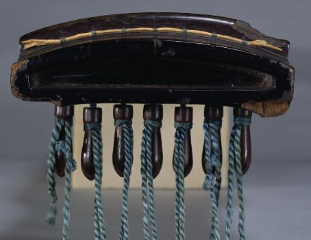 这些贝壳被切割成圆形,标示了可以拨弦的位置。为了使弦能够顺利通过,琴上还设有带状突起。背面上有两个竖长的回声孔,增强了琴的共鸣效果。