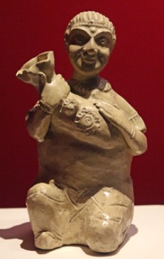 器物整体作站立胡人造型,头部形成尊口,身躯中空为容器主体。人物面部特征刻画具有典型西域胡人形象特征,深目高鼻,蓄络腮胡须 。双手交叠于胸前形成器耳,衣褶纹理采用浮雕技法表现,褶皱线条自然流畅,造型取材于生活中常见的胡人形象。