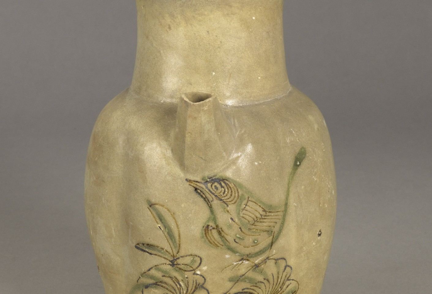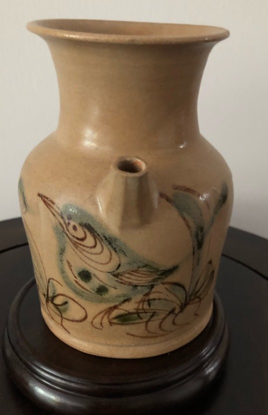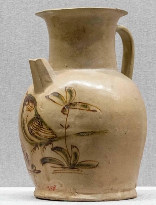 以黄釉为底,采用褐彩绘制花鸟图案,属于釉下彩品种。早期仅用含铁色料绘画,花纹呈褐色,后来可能加用含铜色料,在氧化气氛中呈绿色,形成黄釉褐绿彩。彩绘线条流畅,花鸟图案栩栩如生,富有动感。