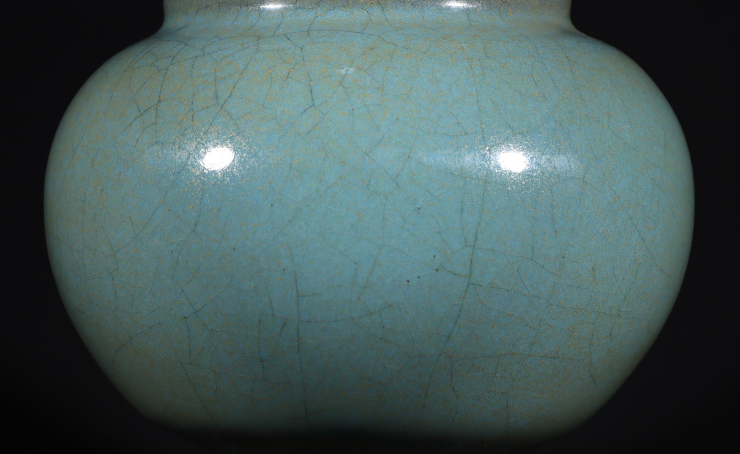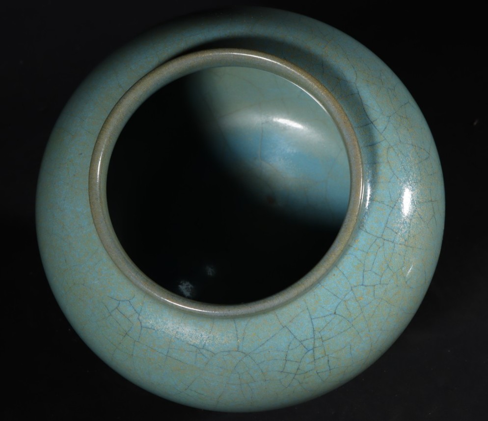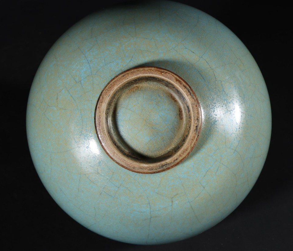 敛口,鼓腹,重心在下腹部,宽圈足。带盖,盖有一钮,釉呈天蓝色,口,边釉薄处为酱黄色釉。造型敦厚,有微小变形,为钧窑的民间作品。