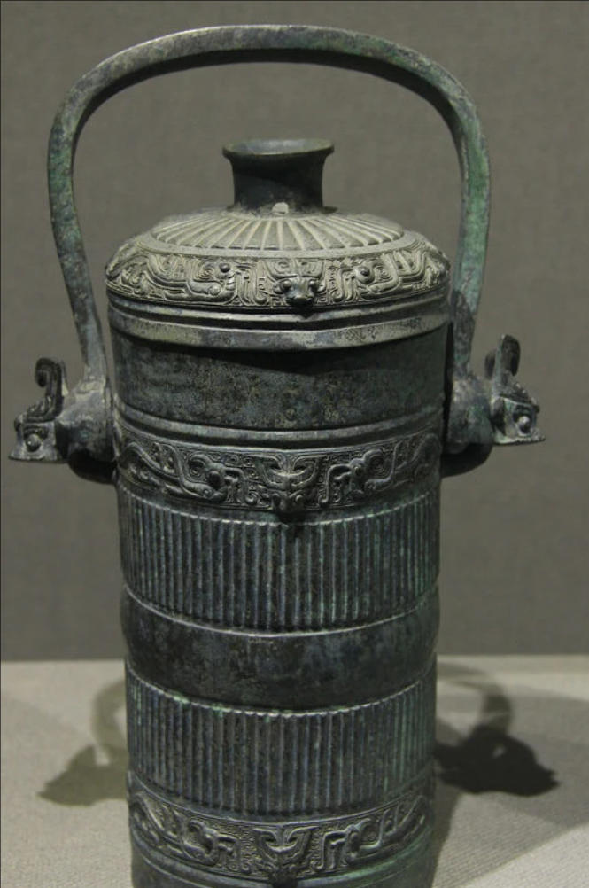 古代盛酒器具。古文献和铜器铭文常有“秬鬯(ju chang,音巨唱)一卣”的话,秬鬯是古代祭祀时用的一种香酒,卣在盛酒器中是重要的一类,考古发现的数量很多。器形是椭圆口,深腹,圈足,有盖和提梁;腹或圆或椭或方,有也作圆筒形,作鸱鸮(chi xiao,音吃消,猫头鹰一类的鸟)形,或作虎吃人形的等等。卣主要盛行于商代和西周,一般说,商代多椭圆形的或方形的卣,西周多圆形的卣。西周卣承商代形制而有所变化,其中最有特色的是鸟兽形卣。鸟兽形有提梁的容酒器,一般统称为鸟兽形卣。