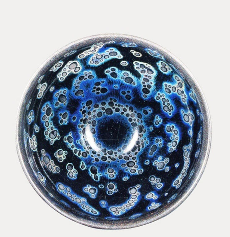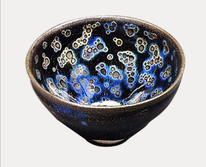 曜变天目茶碗是南宋时期福建建安水吉窑出品的一种黑釉建盏。众所周知,南宋文人的闲情雅趣中有一样活动就是斗茶。当年女词人李清照和她的夫婿赵明诚就非常喜欢闲来无事时猜猜谜,斗斗茶。而曜变天目茶碗刚烧制出来时就是用来斗茶的。