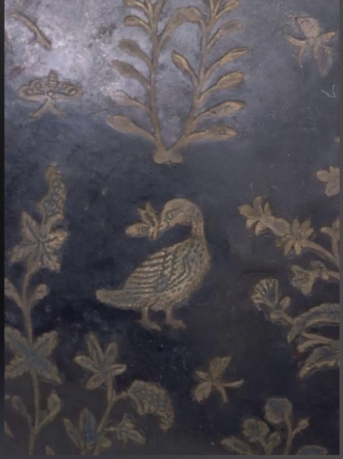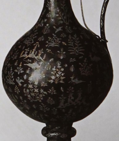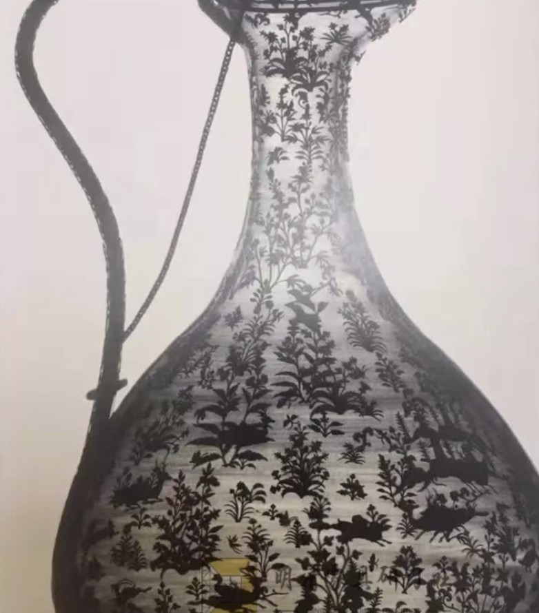 中国唐8世紀正仓院宝物,这是《国家珍宝帐》中记载的胡瓶,是圣武天皇的遗物。胡瓶器腹鼓起,有把手,这一造型来自波斯萨珊王朝。器盖似鸟兽,通过银链与把手相连。黑漆表面饰以银,纹饰表现了花草繁茂的原野上奔驰的鹿和飞舞的鸟。