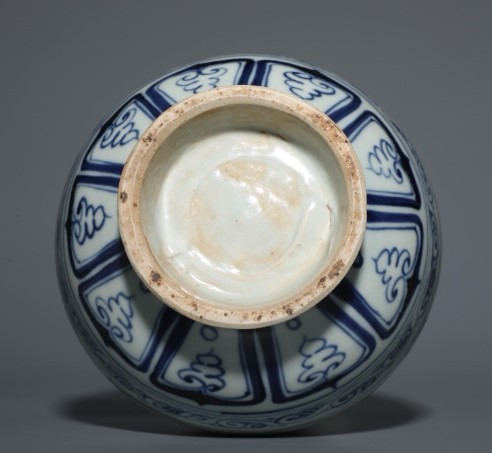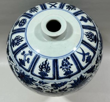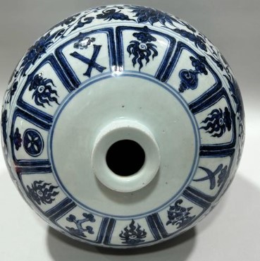 配以覆杯形盖,中置宝珠钮,盖内中心置空心圆柱形直管,合盖时不易脱落。此梅瓶纹饰多达九层,但却排列有序、主次分明。腹部主题纹饰为缠枝牡丹,花叶肥硕,其余部位分别配以卷草、仰覆莲、格锦、灵芝、弦纹、云肩等辅助纹饰,云肩内填水浪,衬以荷莲。此瓶造型端庄挺拔,轮廓线秀美圆润,胎质坚实,青花发色浓艳青翠,料浓处见黑斑,构图丰满而雅致,釉面莹润光亮,无愧于“冰肌玉骨”之美誉。属元代青花梅瓶之上品。