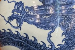 宣德青花图案以线条流畅、纹饰豪放生动著称。夔龙纹样用于青花瓷始于宣德朝,至成化时已成为瓷器上的典型图案,后世亦多延用。宣德时所用青料据明万历时王世懋《窥天外乘》和黄一正《事物绀珠》中所记为“苏麻离青”,这种青料含铁量高,含锰量低,在适度的窑炉气氛下烧成后能呈现宝石蓝般鲜艳的色泽,但由于含铁量高,在青花色彩上常自然形成不均匀的黑色结晶斑点,与艳丽的蓝色相互映衬,更增其艺术魅力。此罐之青花色泽即具有这一时代特征。