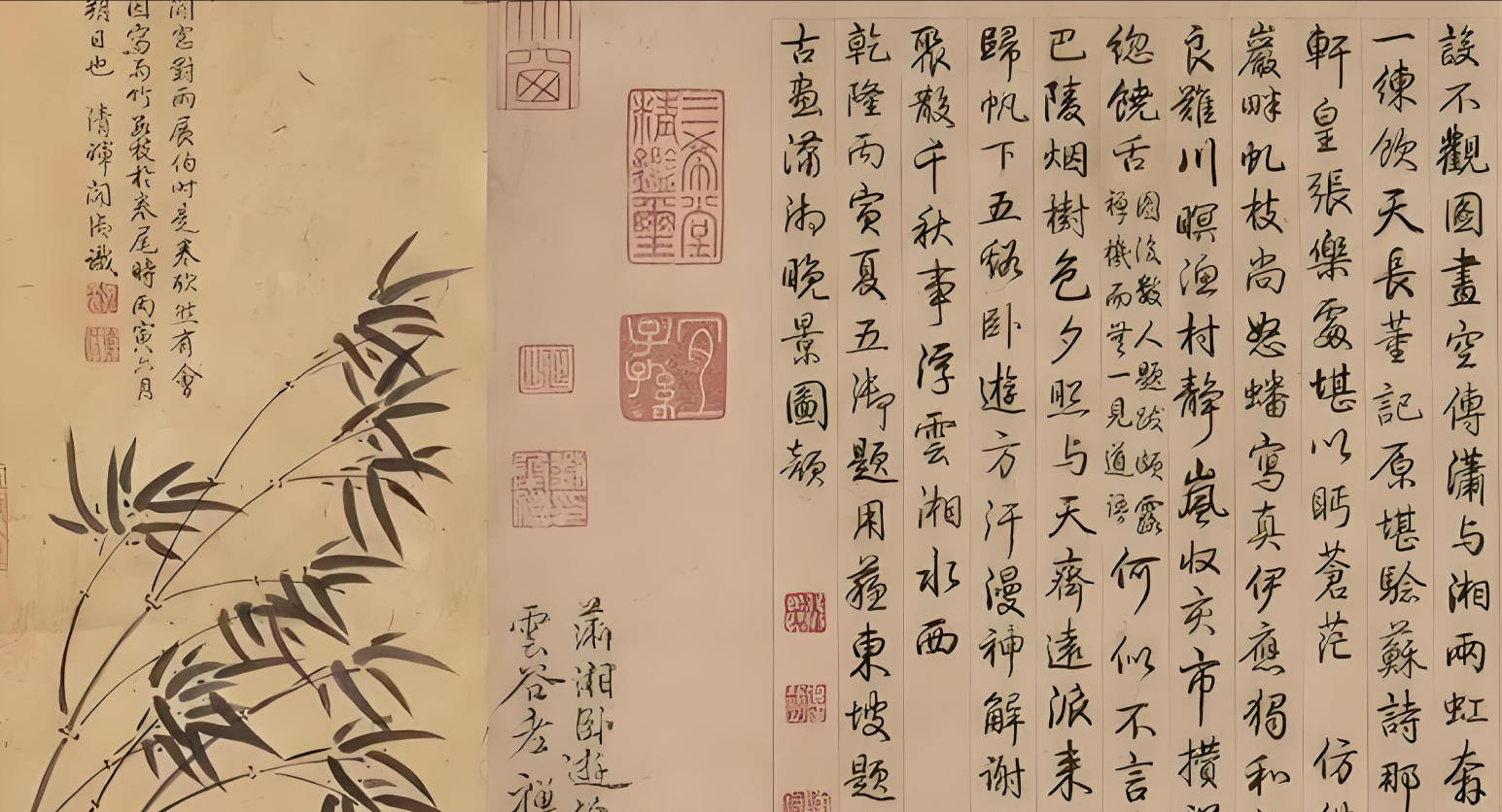 《潇湘卧游图》为纸本墨笔,纵30.2厘米,横399.4厘米,意境开阔,大开大阖,随着观者视觉的移动,描绘了潇湘美景。 [3]卷首有乾隆皇帝御题“气吞云梦”四字。乾隆帝又于卷中两处分别题有一跋一诗,题咏不足,又在卷尾画了一丛竹子并有款识。