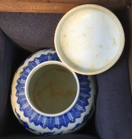 该罐为典型的明代官窑器型,直口短颈,丰肩敛腹,圈足规整,整体线条流畅端庄。器高约18.5厘米,口径9.9厘米,比例协调,兼具实用性与陈设功能。胎体轻薄坚致,透光性强,从内壁可隐约透视外壁纹饰,体现御窑制胎工艺的精湛水准