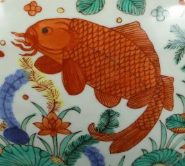 这件五彩鱼藻纹罐的罐身图案主次分明,颈部绘有一圈变形莲瓣纹,腹部以青花、枣红、娇绿、米黄等釉彩搭配,描绘鱼藻莲花纹,八条红彩鱼姿态各异,穿梭于水藻之间。这些红彩鱼以黄彩为地,以褐色勾画鱼的轮廓和鱼鳞,画工十分精细。这些鱼有的向前游弋,有的转身回望,充满动感。罐身的空白处装饰有水藻和莲花图案,大片的绿色荷叶、含苞待放的花蕾,勾勒出一幅鱼戏水藻的美好画面。瓷罐的底部用青花描绘一圈蕉叶纹,显得素雅大方