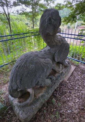 材质:灰白色石灰岩,表面风化但仍可见细腻雕工,高约2.5米,长3米,基座饰有莲花纹