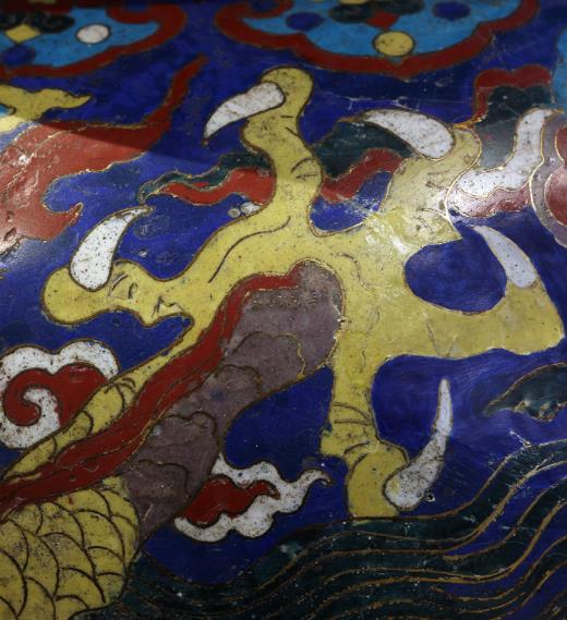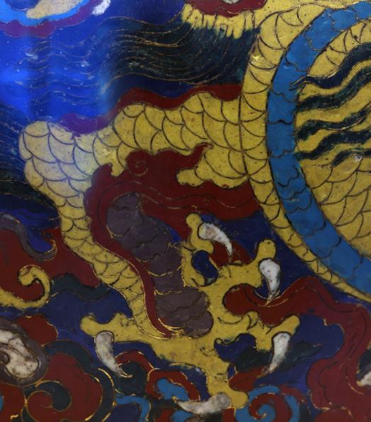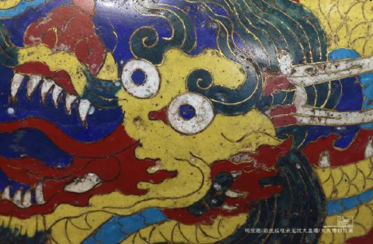 该器物是现存可考年代最早的宫廷掐丝珐琅陈设器,其双款制式证明宣德朝御用监已建立起规范的珐琅器生产体系。器物融合了元代珐琅器的浑厚风格与明代新兴的精细工艺,饰有奔戏宝珠的行龙纹,采用宝蓝色珐琅为底,搭配紫黑色及多色交映的卷云纹,龙身施大面积黄彩,呈轮状五爪张弛有力 。釉料配方具有时代特征,检测显示宝蓝色釉含氧化钴,黄釉含锑酸铅成分,与《宣德鼎彝谱》记载的"佛头青""密陀彩"配方相符。盖罐的铸造工艺反映明代早期掐丝珐琅工艺的巅峰成就,器身饰有奔戏宝珠的行龙纹