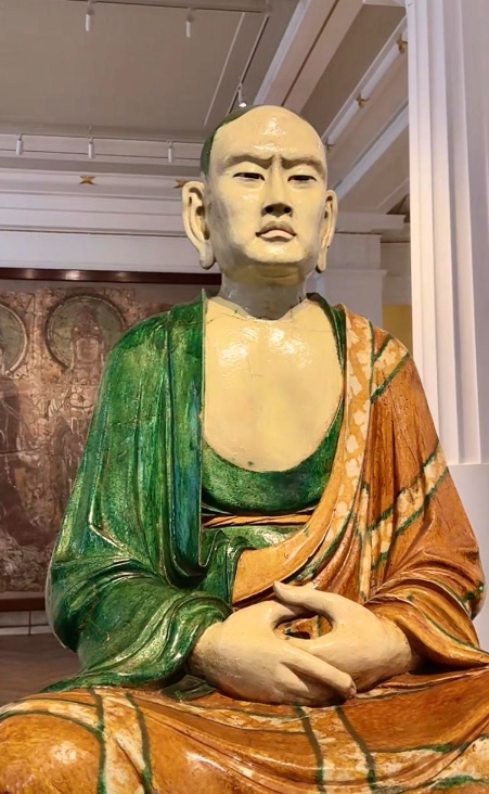 此罗汉像为真人尺寸(高约1.2米),陶胎施三彩釉,展现佛陀弟子禅定姿态。其写实主义风格尤为罕见:面部肌肉、手部血管、衣纹褶皱均高度还原人体结构,被梁思成评价为“媲美罗马雕塑,精细程度不亚于意大利文艺复兴杰作”。相较传统宗教造像的程式化,此像以人性化表情传递禅意,颠覆东方雕塑传统
