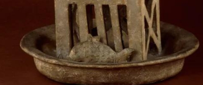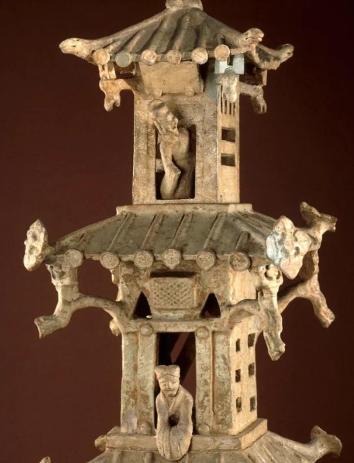 在公元25年至220年间的东汉墓穴中常发现为来世生活准备的人物、房屋和农舍的陶器模型。这座三层高的望楼模型很可能来自于当时一位颇有权势的地主或军阀的墓葬。