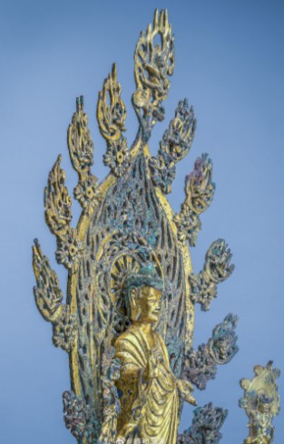 面容清瘦,肉髻高耸,右手施无畏印,左手施与愿印,袈裟衣纹厚重下垂,背部火焰纹背光镶嵌绿松石。