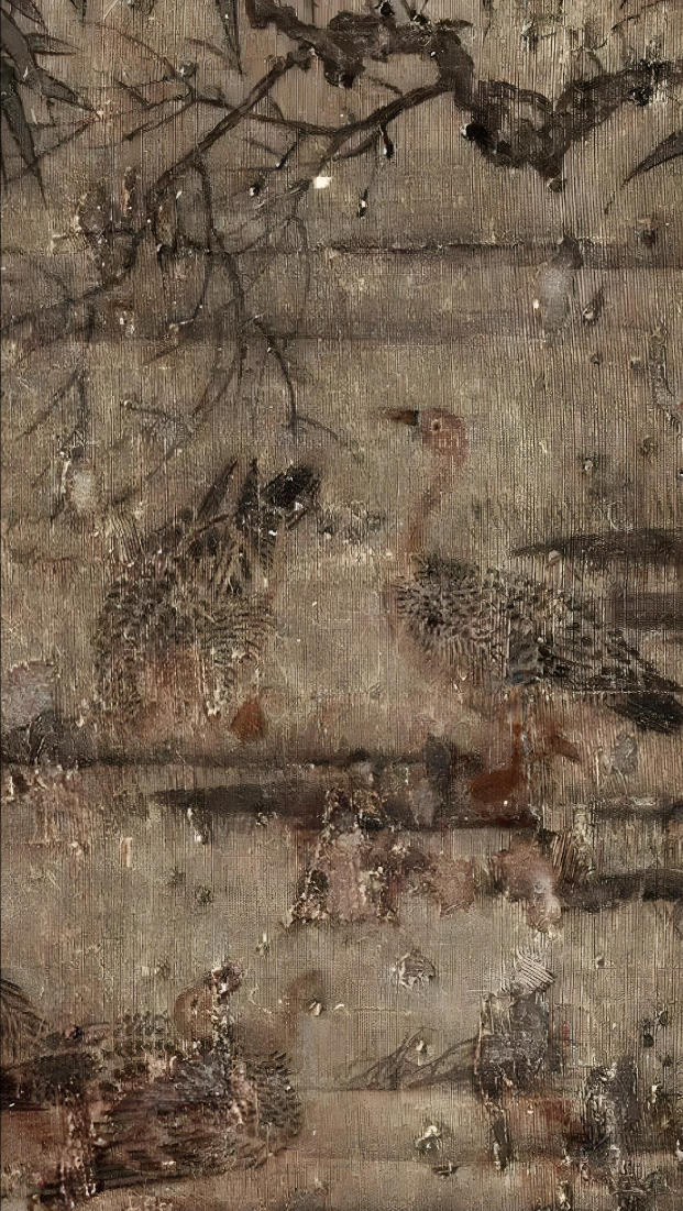 《竹塘宿雁图》图下方绘有大雁群栖在败芦枯蓼的汀洲中,是小景画中常见的情景。右方的土坡为细竹林,其中有枯木如倒卧一般伸出一枝树干。枯木梢上停着一只小鸟,令人印象深刻。枯木上还夹着两枝斜向伸出的竹子,其中一枝下垂,竹枝张开将视线遮住。竹子以细墨线勾出,淡绿色赋彩。芦苇以淡墨色勾出,淡褐色赋彩。枯木以抑扬笔线勾出,加淡墨的小笔触绘成。与此类竹与树木的描绘手法相比,大雁并无轮廓,即采用“没骨”技法,展示了主题与画法的传统,意味深长。水面和余白以淡蓝色渲淡,用来充实空间表现