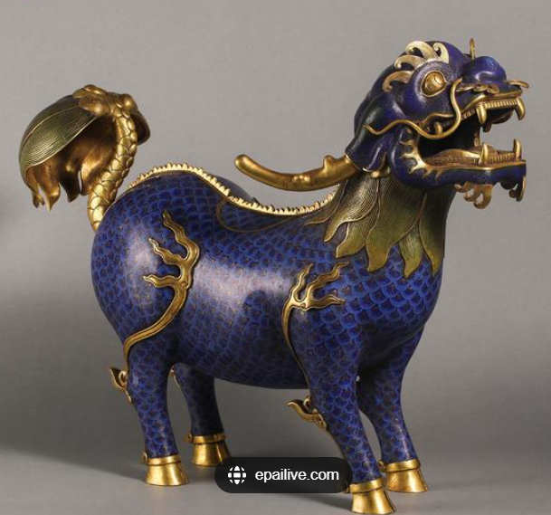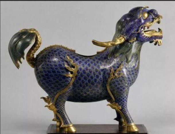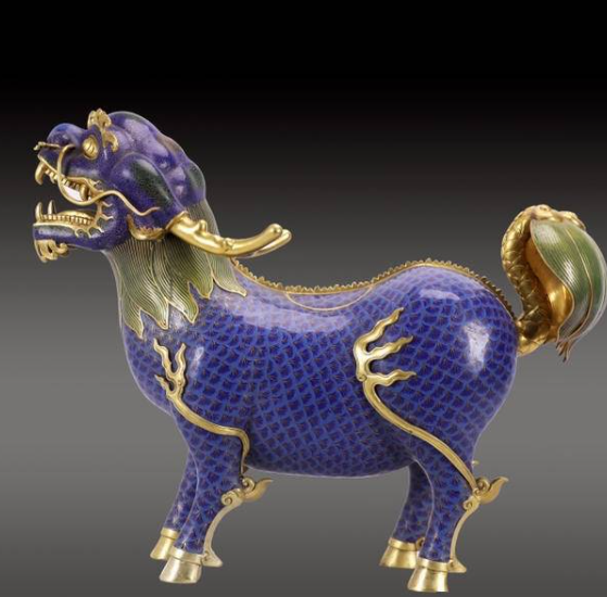 景泰蓝(掐丝珐琅)在清代乾隆朝达到工艺巅峰,常作为皇家礼器或陈设器。麒麟是中国传统祥瑞神兽,象征“仁德”与“太平”,此类器物多为宫廷造办处烧制,用于宫殿装饰或赏赐重臣。其流失反映了近代中国文物流失的历史,也是研究清代工艺与文化交流的重要实物。