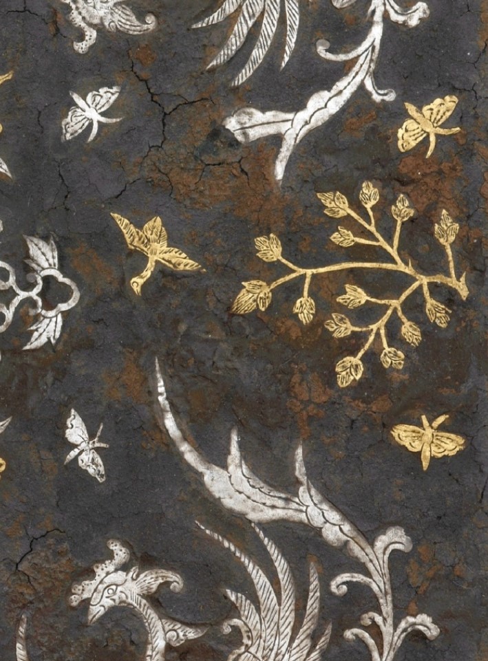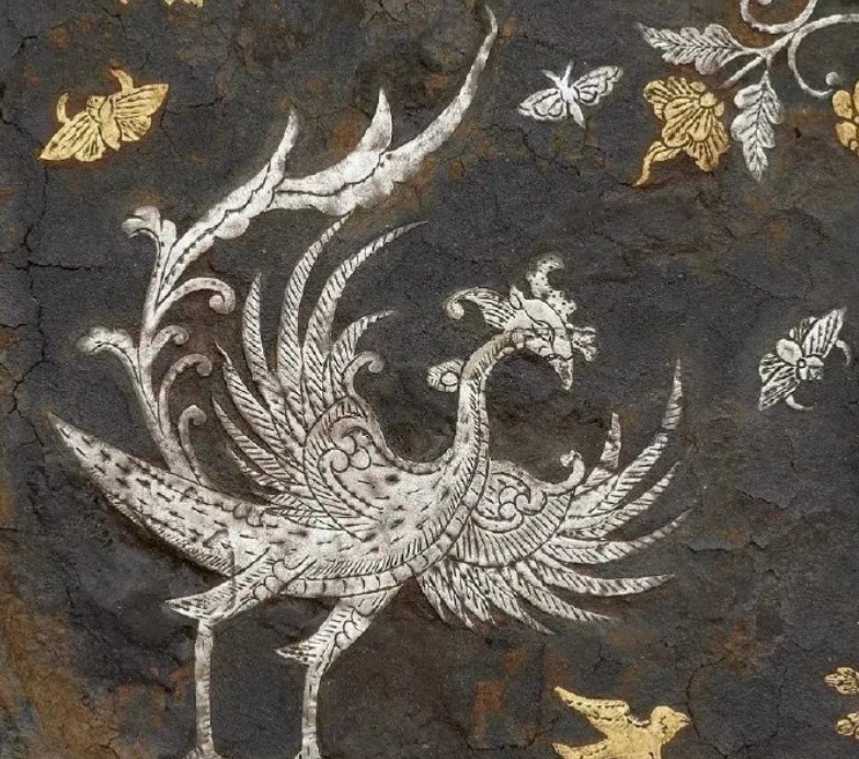 弗利尔美术馆收藏的唐代金银平脱凤鸟纹方镜,主体图案是凤凰和缠枝花,四周还配合了蝴蝶、小鸟的造型,金银组合的纹样异常华丽,盛唐时期高超工艺技术和美学设计的代表之作