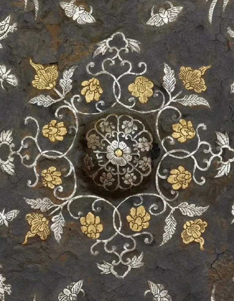 值得一提的是此件文物的制作工艺,称为“金银平脱”。所谓金银平脱镜,就是把黄金和白银通过模子等制成薄片,再裁剪出所需的饰片,再将其贴到镜背上去,空白处填上漆后再细加研磨,使金、银饰片构成的纹饰更清晰地脱露出来