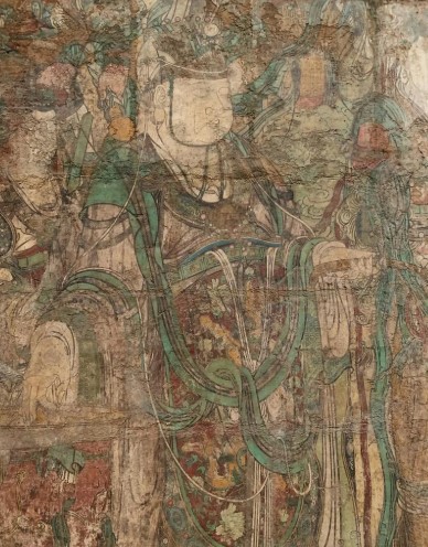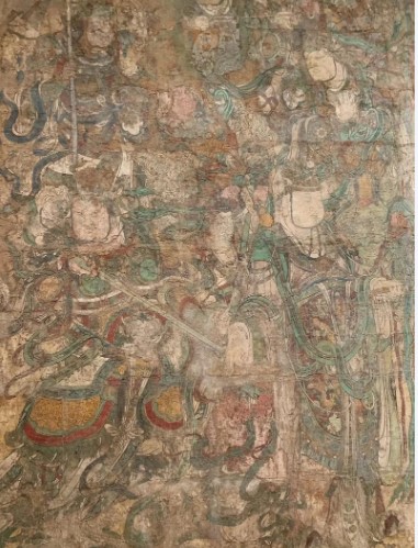 细节工艺:衣饰用金箔勾勒龙纹,菩萨披帛飘逸,神将盔甲鎏金,色彩以红、绿、金为主,局部贴金剥蚀可见。线条“曹衣出水”,人物面部丰润,体现元代“重彩勾填”技法,背景绘东方琉璃净土世界,散花童子与飞天增强动感