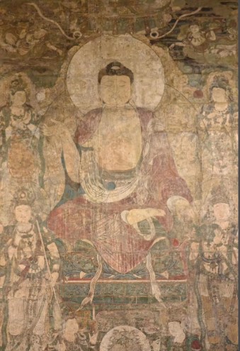 创作于至正十四年(1354年),元大德七年(1303年)平阳大地震后,为安抚民众绘制,药师佛象征祛病消灾,炽盛光佛抵御天灾。