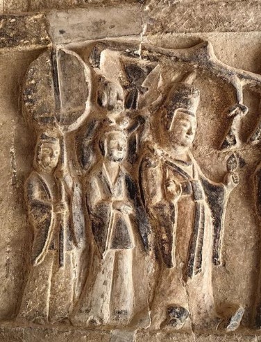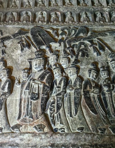 浮雕中孝文帝着汉式冕服(冕旒、宽袖革带),侍从仪仗(华盖、羽葆)完全采纳汉制,印证“禁胡服、行汉礼”的改革政策