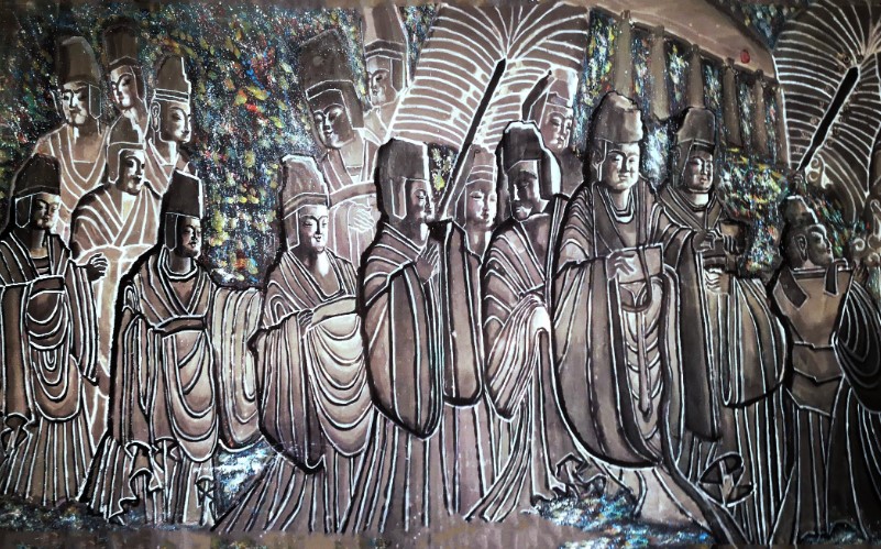 采用高浮雕技法,衣纹流畅自然,衣袖下垂动态逼真,人物面部庄重,整体布局“连环画式”,兼具宗教肃穆与宫廷生活气息