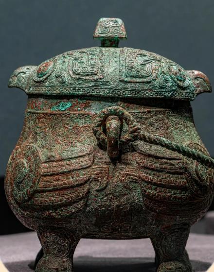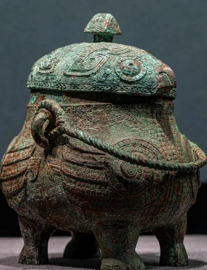 采用商代成熟的“合范法”铸造,器盖与器身严丝合缝,口沿下方设有半环状提梁把手,兼顾实用性与仪式感