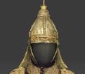 头盔(胄)为银质,镶嵌珊瑚珠、青金石及绿松石,连接丝制护颈、护耳和顶端原有盔缨已缺失。头盔边缘的梵文起到护佑平安的作用。