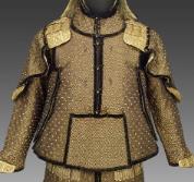 清代锁子锦仪式用甲胄是乾隆至嘉庆年间(约1780–1820年)由江南织造局专为宫廷仪典打造的礼制武备。其黄底锁子锦、鎏金龙纹铜板及梵文头盔融合满、汉、蒙、藏多元文化,用于八旗阅兵、祭祀等场合,象征清廷“以武立国”的统治权威,代表清代官营织造与金属工艺的巅峰。