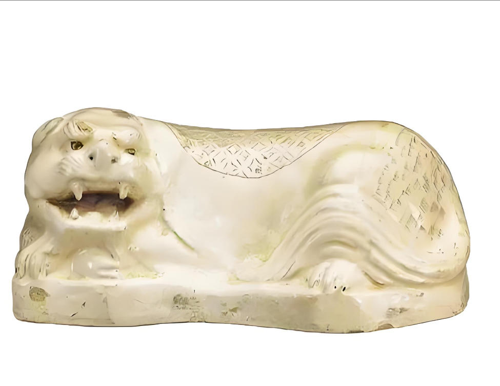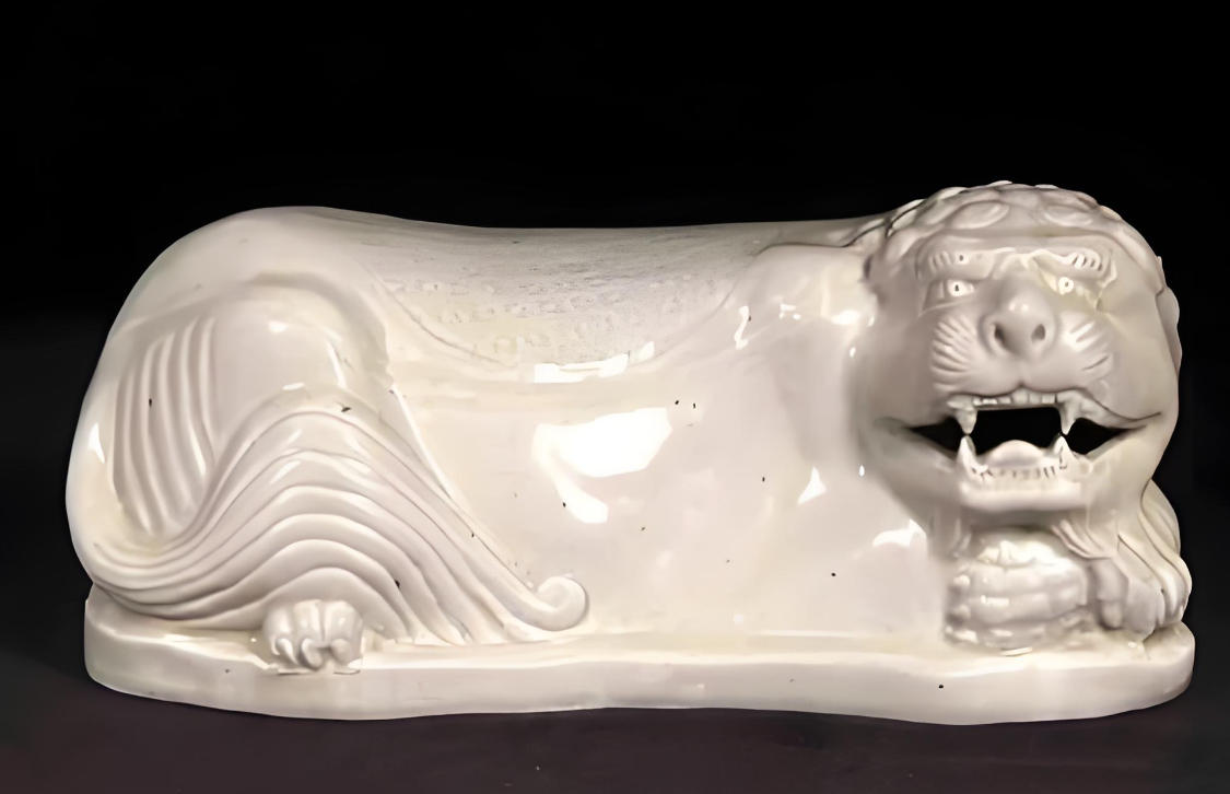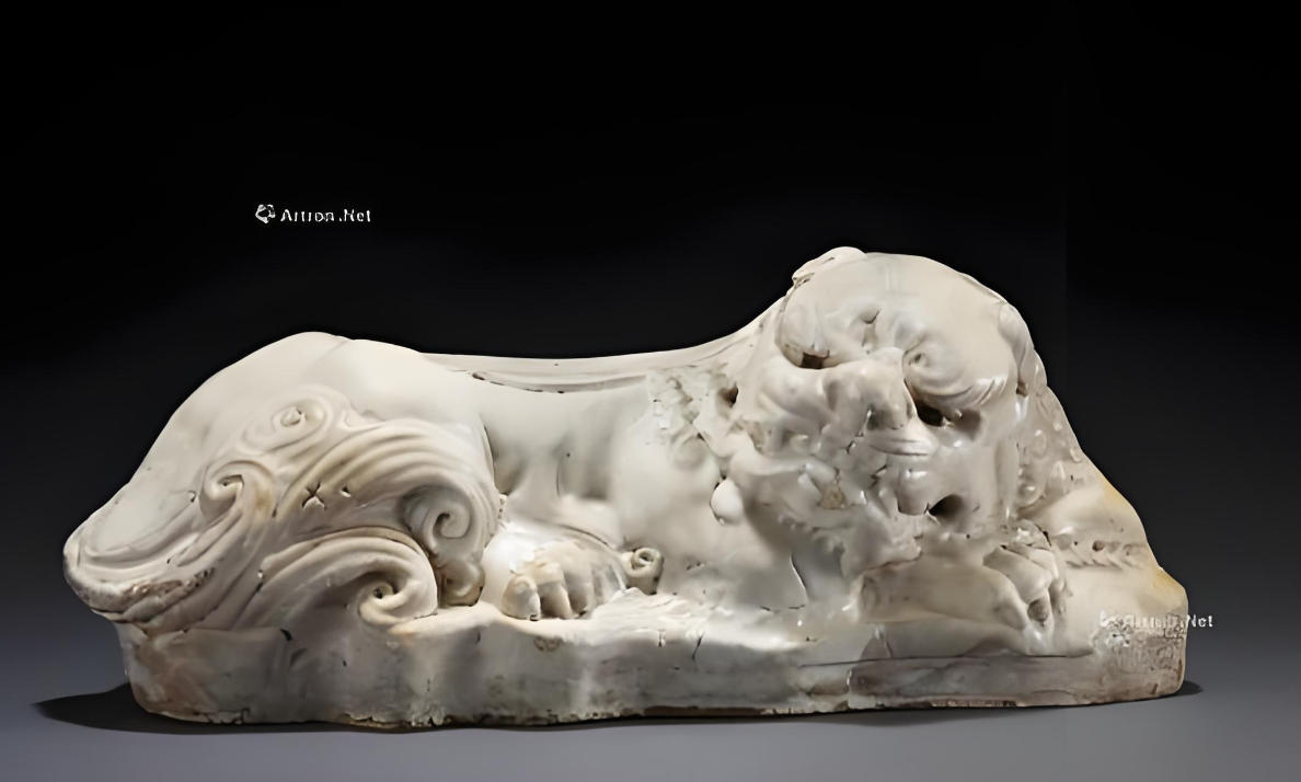 这款北宋时期的“白釉狮子枕”,尺寸为高16.4cm、长37.7cm,产自磁州窑,枕面设计巧妙地利用了卧狮脊背的弯处,前低后高中间凹,不仅吻合人体的自然形态,使仰卧与侧卧时更加舒适,还让狮子整体造型显得更加生动。
