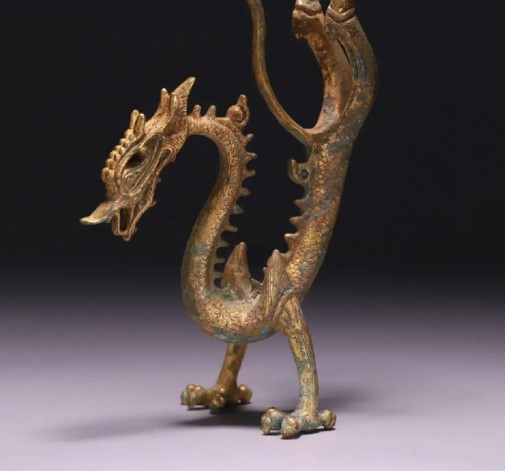 造型:常见“S”形动态设计,龙身细长蜿蜒,龙头高昂,双目圆睁,口露利齿与卷舌,龙角后伸,鬃毛飞扬(如鎏金铁芯铜龙长28厘米,重2.8千克)。