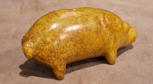 形制:多呈长柱形卧伏状,长度10-12厘米(如亳州玉猪长11.6厘米,河北白玉猪长10.3厘米),底面平整便于握持。以阴刻线勾勒猪耳、拱鼻、四肢,如河北白玉猪用“汉八刀”刻出背脊线条,仅数刀即显神韵。部分尾部穿孔(如曲阜青玉猪),或保留原始切割痕(如陕西华阴出土品)。材质:多为和田白玉或青玉,质地莹润无杂质,表面抛光细腻
