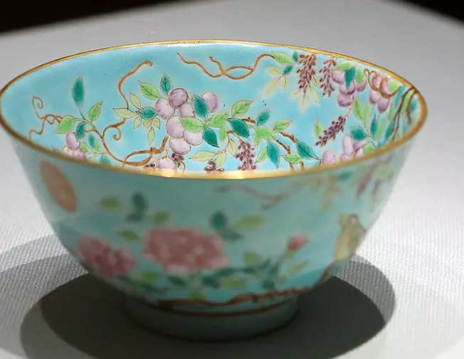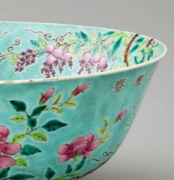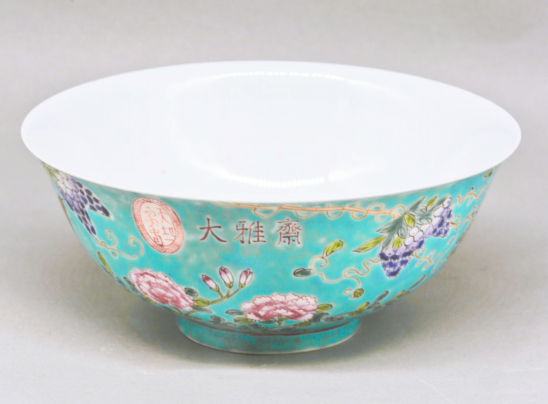 碗高9厘米口径20.4厘米,通体内外松石绿釉地粉彩装饰,绘有花鸟及藤萝枝蔓,口沿下空白处自右向左署矾红彩楷书“大雅斋”三字。通体以松石绿釉为地,粉彩绘牡丹、月季等花卉与画眉鸟,花瓣层次分明,鸟羽以粉黄、赭石色细笔勾染,色彩清新柔丽