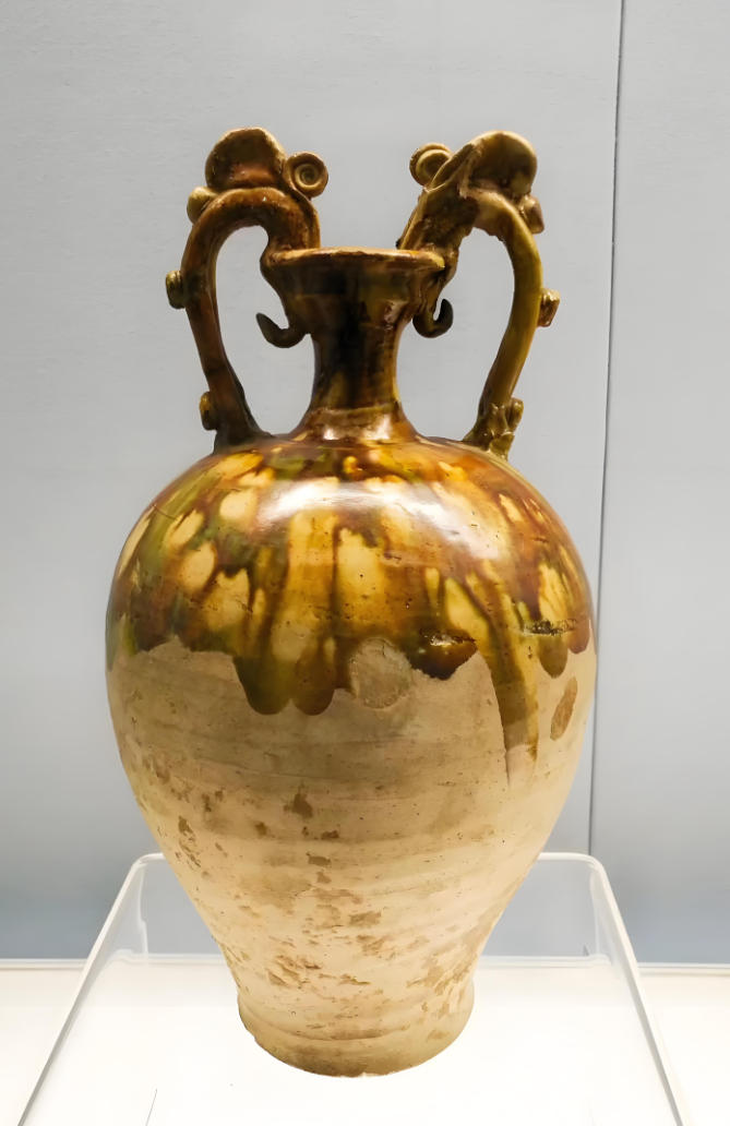 釉面处理突破单色釉传统,采用分层施釉法:颈部铺洒绿釉象征云气,腹部黄釉为底描绘缠枝纹,其间点缀白色联珠纹,三色交融处形成自然垂流,该技法源自唐代丝绸印染中的晕缛工艺。器物高约45-60厘米,小口、长颈、鼓腹的造型比例,既符合中亚金银器原型特征,又适应了唐三彩明器随葬需求