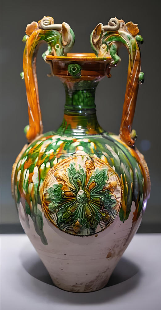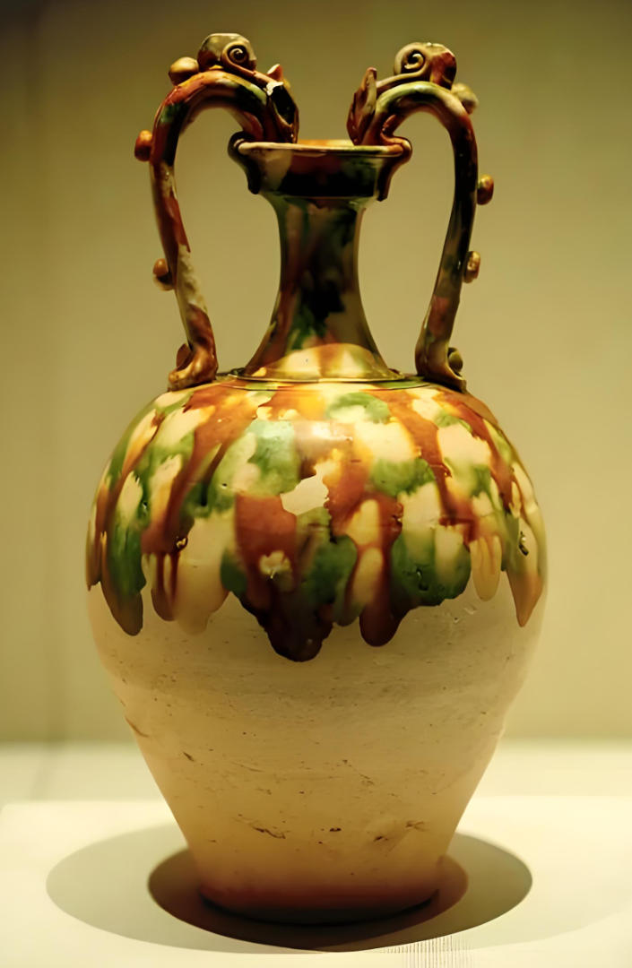 三彩龙耳瓶作为唐代陶瓷工艺创新的代表性产物,其器型演变深刻反映了丝绸之路上的中西文化交流。8世纪中叶(盛唐时期),唐三彩制作工艺达到巅峰,洛阳作为唐代东都汇聚了大量波斯、粟特等西域商旅,外来器物造型技法与中原传统装饰艺术的交融互鉴,最终孕育出此类兼具异域风情与本土审美特征的创新器型。