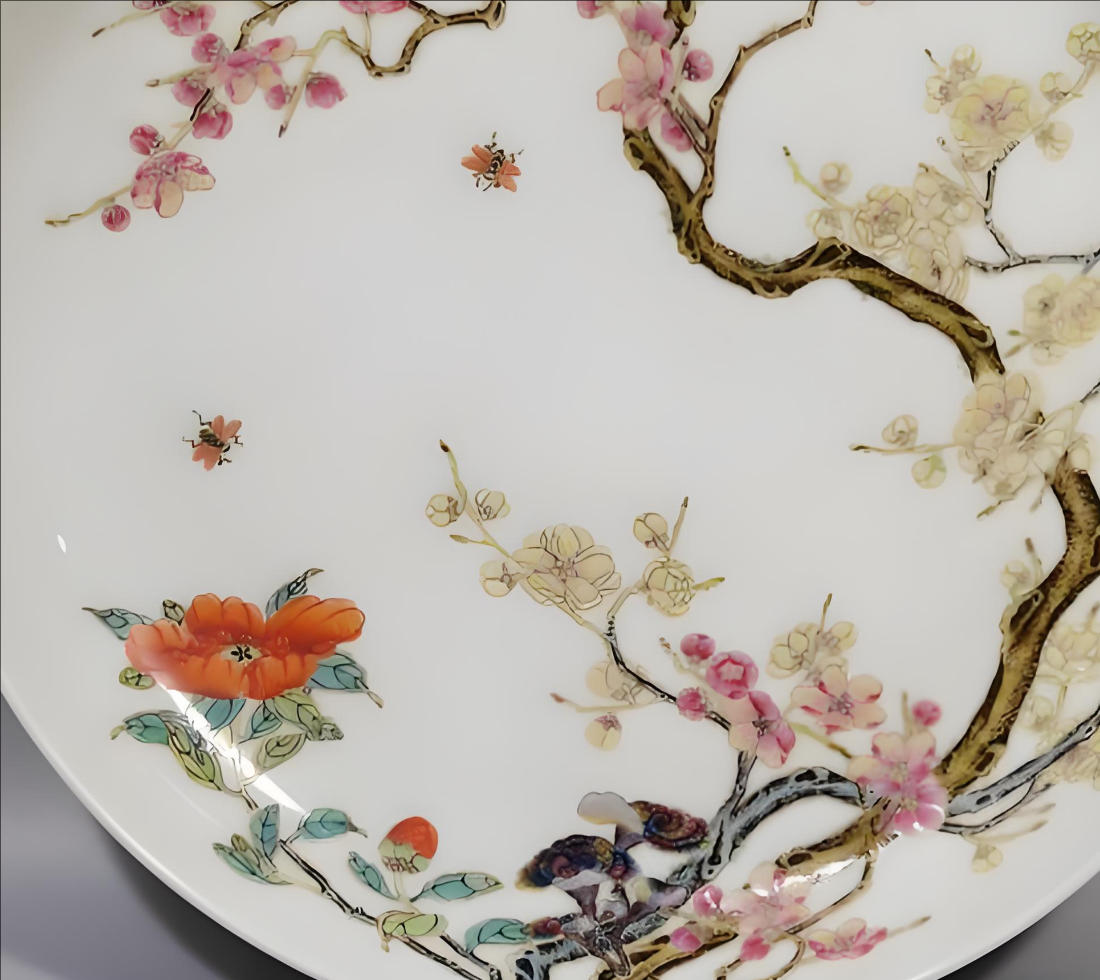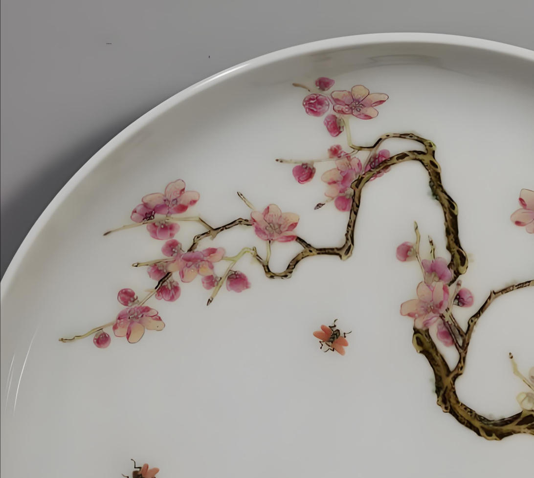 此盘为景德镇窑所制,采用清代官窑经典粉彩工艺,以梅树纹为装饰主题。粉彩作为康雍时期的重要瓷器品种,融汇了两朝制瓷精髓,尤以其细腻柔和的彩绘技法闻名于世。