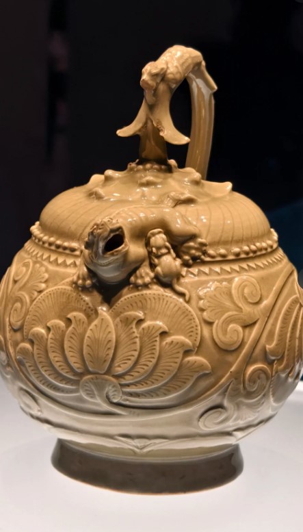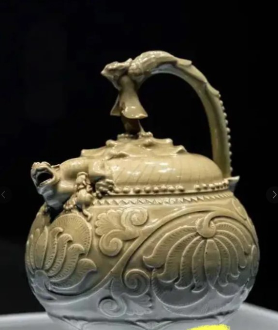 通高 21 厘米,口径 4.5 厘米,底径 7.8 厘米。壶身呈瓜棱形,直口,溜肩,鼓腹,圈足外撇。肩部置双凤首流,凤喙微张作吐水状,柄为摩羯鱼形,鱼尾上卷与壶口相连。腹部剔刻缠枝牡丹纹,花瓣翻卷,叶脉清晰,施釉后纹饰呈 “凹面积釉” 效果,颜色深于器身
