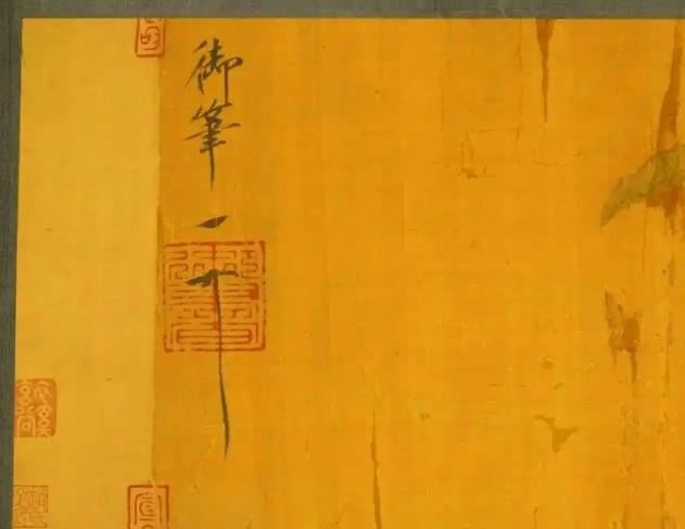 《写生翎毛图》为绢本设色长卷(装裱后尺寸约26×281厘米),传为宋徽宗赵佶所作,现藏大英博物馆。画卷主体描绘荔枝树与栀子树交叠生长的生态场景:枝头悬挂饱满红艳的荔枝果实,七只禽鸟(含青冠雀、寿带鸟、绿绣眼)栖居其间,一只蝴蝶翩跹于洁白栀子花丛,构图繁密而生机盎然。卷首题瘦金体“御畫寫生翎毛圖”签,卷尾落“御筆”款及“天下一人”花押,钤双龙方印、宣和、政和等宋内府鉴藏印,保留典型的“宣和装”原裱格式(黄绢隔水),但清宫收藏印缺失。画作采用工笔重彩技法,禽鸟羽毛分层渲染细腻,荔枝果实以胭脂红点染立体感强烈,叶片正反向背色彩过渡自然,体现宋代院体花鸟画的巅峰写实技艺.