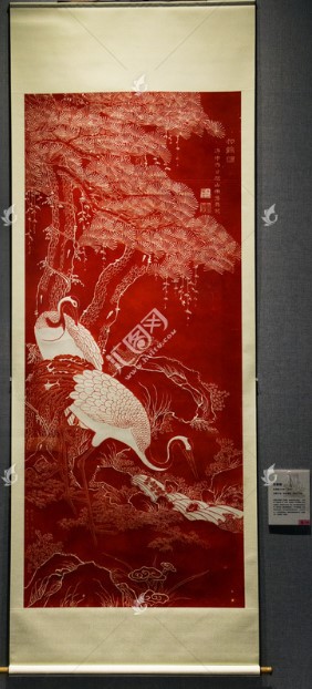 通宽 624 厘米,高 320 厘米,共 12 扇,每扇宽 52 厘米。屏心以黑漆为地,上绘松鹤延年图:苍松盘曲,仙鹤 12 只姿态各异(或展翅、或梳羽、或衔芝),间以祥云、山石、流水。每扇屏额嵌 “康熙辛未年製”(1691 年)款识,边框浮雕缠枝莲纹,屏座雕瑞兽足