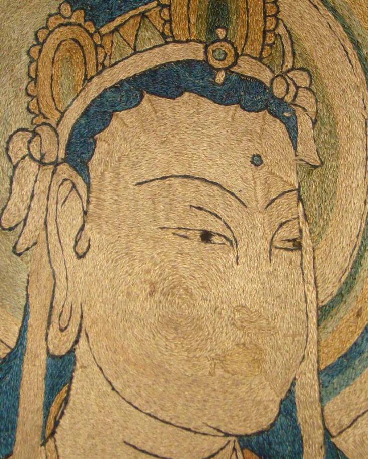 敦煌劫难:1900年藏经洞发现后,1907年英籍探险家斯坦因(Aurel Stein)以500卢比(约25英镑)购得包括此绣品在内的29箱文物,经印度运抵伦敦。