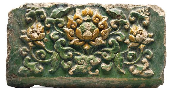 黄绿釉西番莲花砖:中央为黄色大莲花(种子荚外露),两侧辅以小黄花,绿釉卷曲“如意”叶纹环绕,立体雕工精湛,实测釉层耐蚀性超同期官窑瓷器。