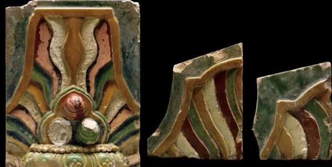 多彩釉垫拱板:用于填补斗拱空隙,出土残件显示其原为黄、绿、赭三色琉璃镶拼,与大英博物馆藏“Franks.922”垫拱板形制一致,表面剥蚀痕可互证年代。