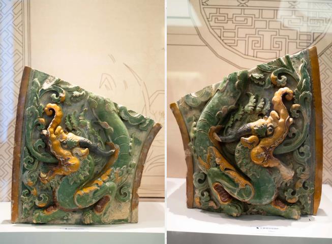 龙子拱门残件:高浮雕“飞天”躯干(属藏传佛教“六拏具”中的“那啰拏”),施青、黄、棕、奶油四色釉,裸身佩珠宝,飘带呈旋涡状动态,工艺特征与南京出土“TE04N04:2号”西番莲花砖完全匹配。