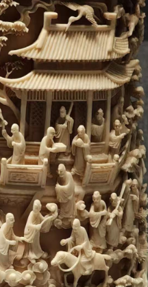 该摆件高约 30 厘米,以一整根象牙精心雕琢而成。主体部分采用多层次透雕技法,展现出一幅生动的古代人物故事场景。人物神态各异,有的拱手交谈,有的抚琴弄乐,有的骑马出行,刻画细腻入微,仿佛能让人听见他们的交谈声。亭台楼阁、树木花草等背景元素同样雕刻得细致逼真,亭阁的窗棂、树叶的脉络都清晰可见,工艺之精湛令人叹为观止。其不仅是一件精美的工艺品,更是清代高超象牙雕刻技艺的杰出代表。