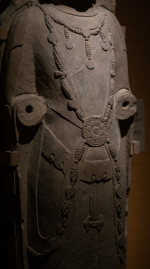 该立像高近2米,采用北齐典型的"形体敦厚、衣纹疏简"风格:菩萨面形圆润丰满,头戴宝冠,冠中嵌化佛;身着通肩式袈裟,衣纹呈阶梯状下垂,腰间束带自然垂落;右手施无畏印,左手持净瓶,跣足立于仰莲座上。其雕刻技法融合印度犍陀罗风格与中国传统艺术,尤其注重表现衣料垂坠感和肌肤的柔润质感