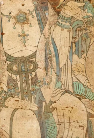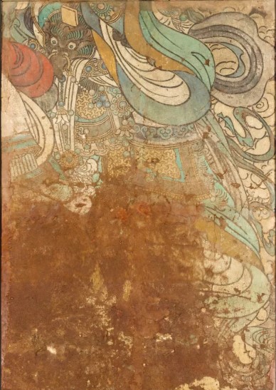 构图:巨幅尺寸达7.5米×15.1米,主尊药师佛结跏趺坐于莲台,左右胁侍日光、月光菩萨,周围环绕八大菩萨及十二药叉神将,顶部绘七佛与飞天,形成恢弘的"东方净土"场景。