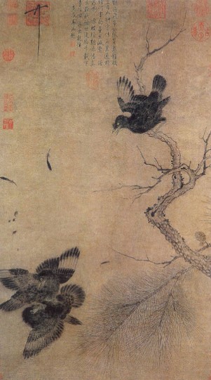 细节:飞鸟双翼展开角度、尾羽分叉等特征符合生物学观察,体现宋代"形理两全"的花鸟画理念