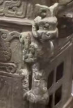 通高20.2厘米,重3.8千克,属中型礼器,双层设计——上层容器壁饰螭纹与鸟纹,下层炉膛设对开双门,门旁各有一完整人形守卫(非断足刖人)。容器四角各置一圆雕顾虎(回首姿态),基座另设四虎承托,形成“八虎拱卫”的立体布局。全球同类型方炉存世不足十件,此器为东亚地区唯一完整保存的“虎足方炉”23。